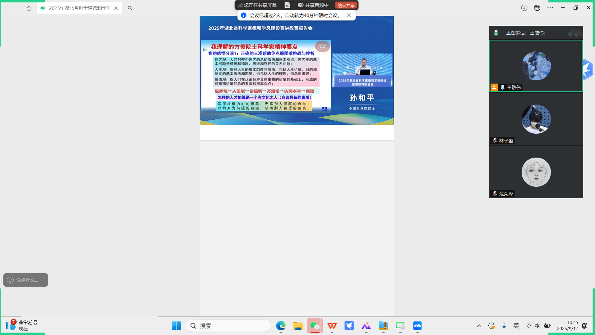 为深入学习贯彻习近平总书记关于弘扬科学家精神和加强作风学风建设的重要指示精神,bw必威西汉姆联官网积极响应湖北省科学道德和学风建设宣讲教育领导小组号召,于2025年9月17日上午9时组织全体研究生、新入职教师及新上岗研究生导师通过线上线下相结合的方式收看全省科学道德与学风建设宣讲教育报告会。