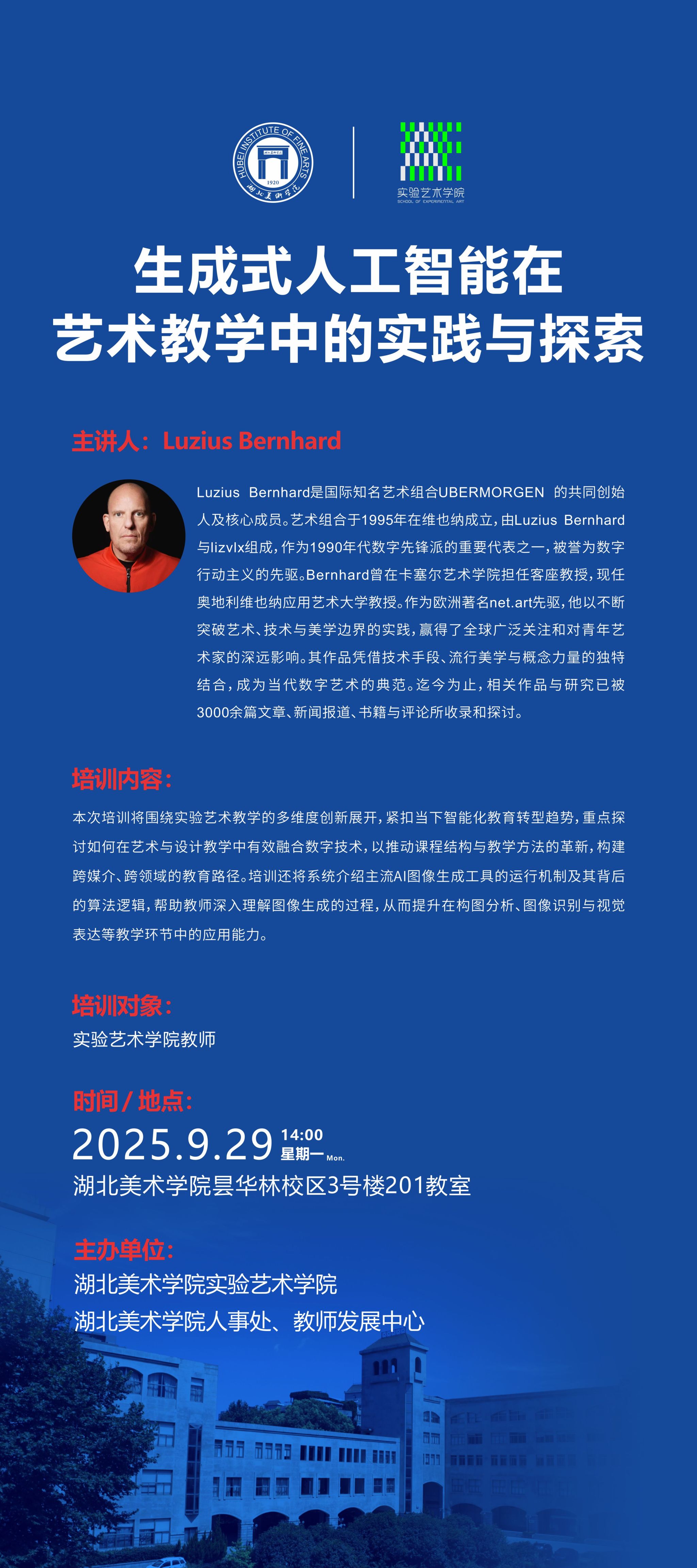 本次活动特邀国际知名数字艺术家、奥地利维也纳应用艺术大学教授Luzius Bernhard担任主讲人,面向bw必威西汉姆联官网教师开展人工智能与艺术教育融合的专题培训。